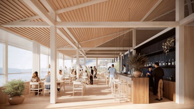 Das Konzept sieht eine ruhige Gastronomie vor. Aus Rücksicht auf die Nachbarschaft orientieren sich die belebteren, bedienten Räume zum Platz und zur Aussicht hin.